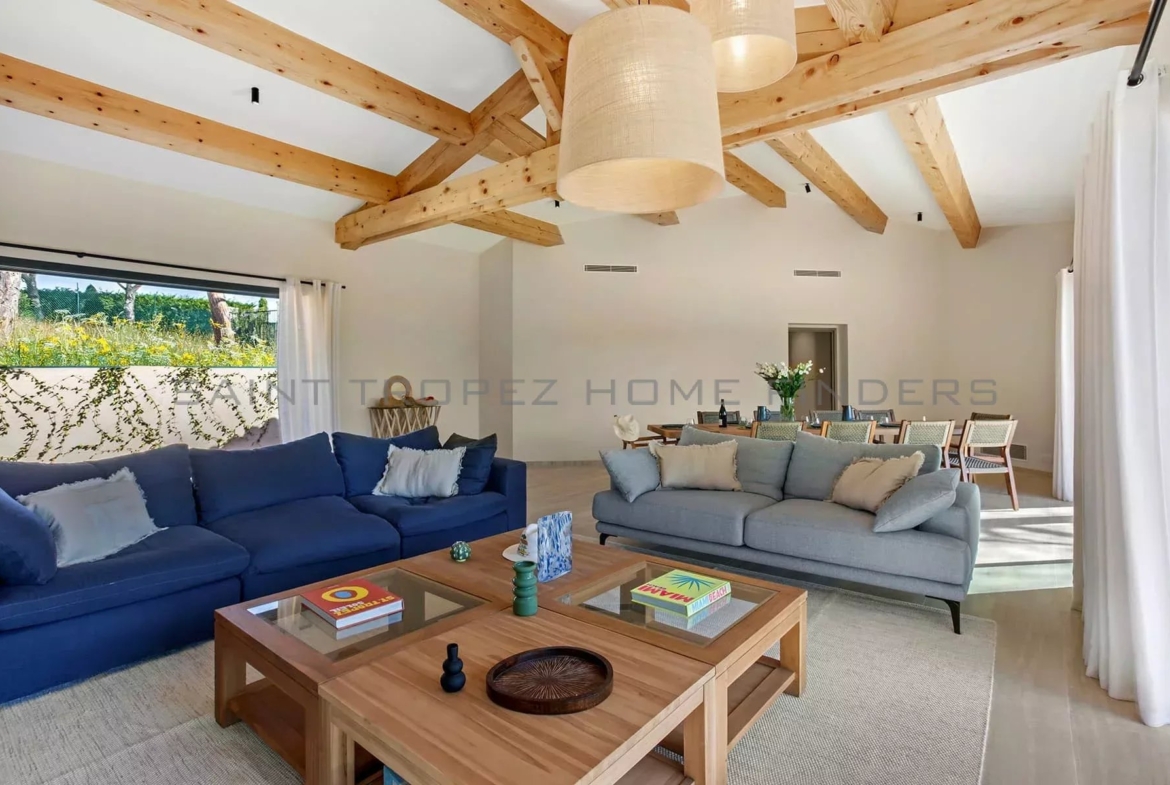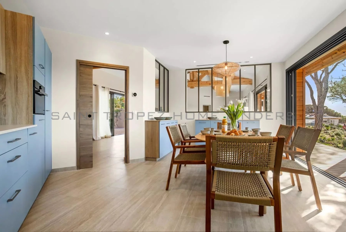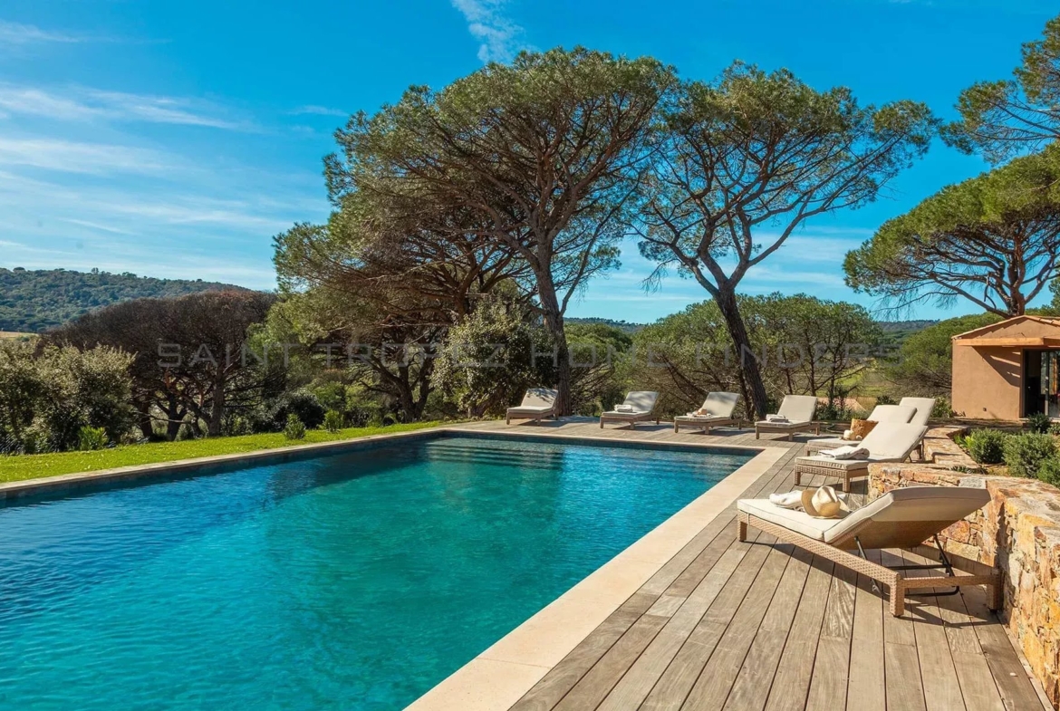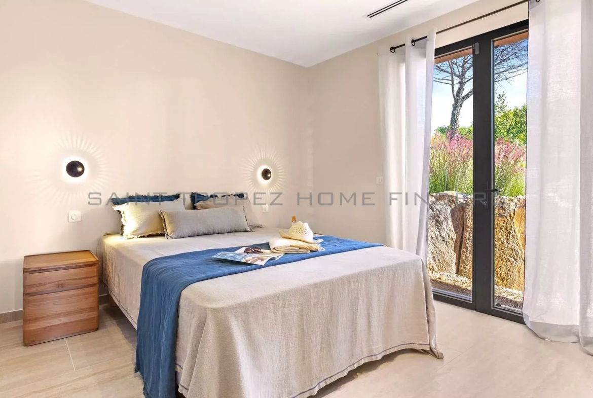 This new villa is situated in a gated estate near the beaches of Pampelonne, with easy access to the village of Saint-Tropez. It is surrounded by extensive landscaped grounds featuring a swimming pool and enjoys beautiful, unobstructed views of the countryside. The single-storey villa offers bright living spaces, with each room opening onto a terrace. The living area adds extra charm with its high ceilings and exposed beams. The villa features high-quality fittings and finishes.