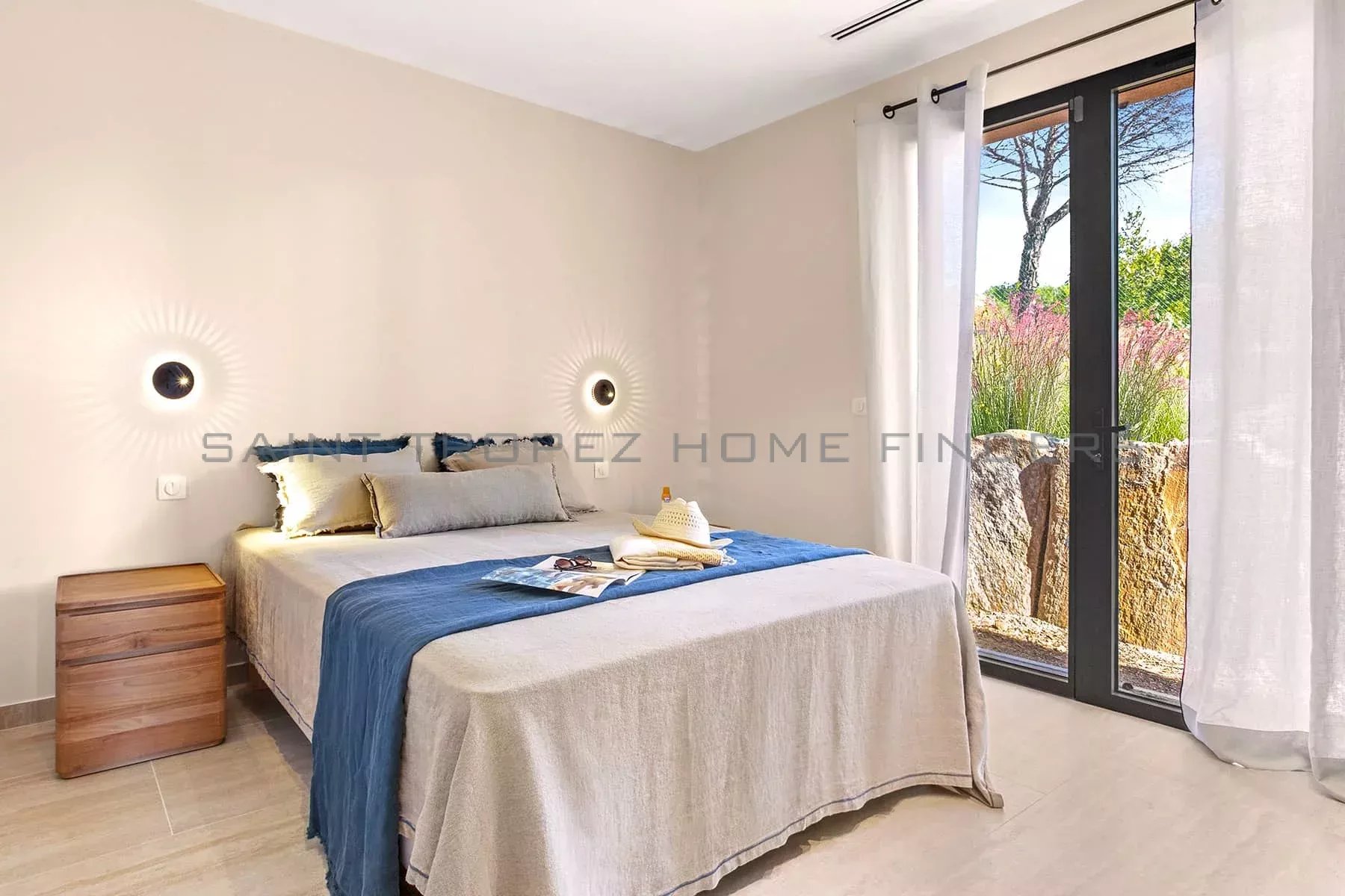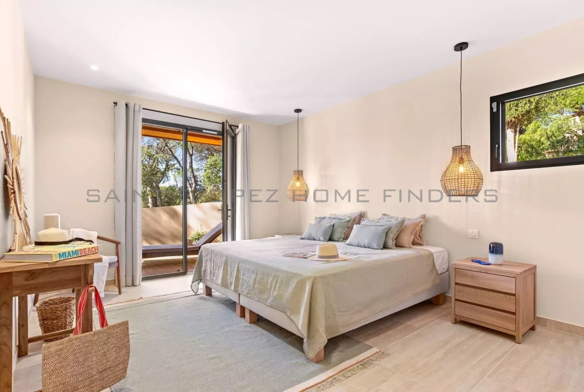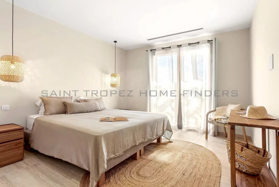 This new villa is situated in a gated estate near the beaches of Pampelonne, with easy access to the village of Saint-Tropez. It is surrounded by extensive landscaped grounds featuring a swimming pool and enjoys beautiful, unobstructed views of the countryside. The single-storey villa offers bright living spaces, with each room opening onto a terrace. The living area adds extra charm with its high ceilings and exposed beams. The villa features high-quality fittings and finishes.